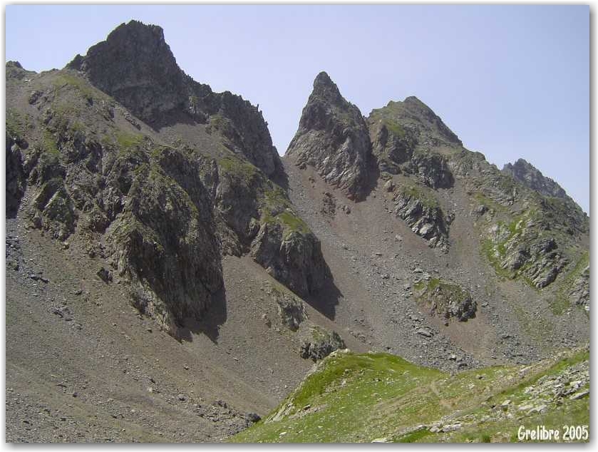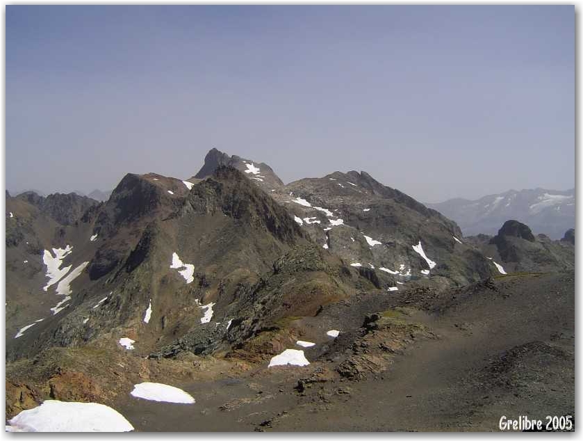 Au centre le Pic du Grand Domenon (2802 m) et le Grand Pic de Belledonne (2977 m) et à gauche le col de Freydane