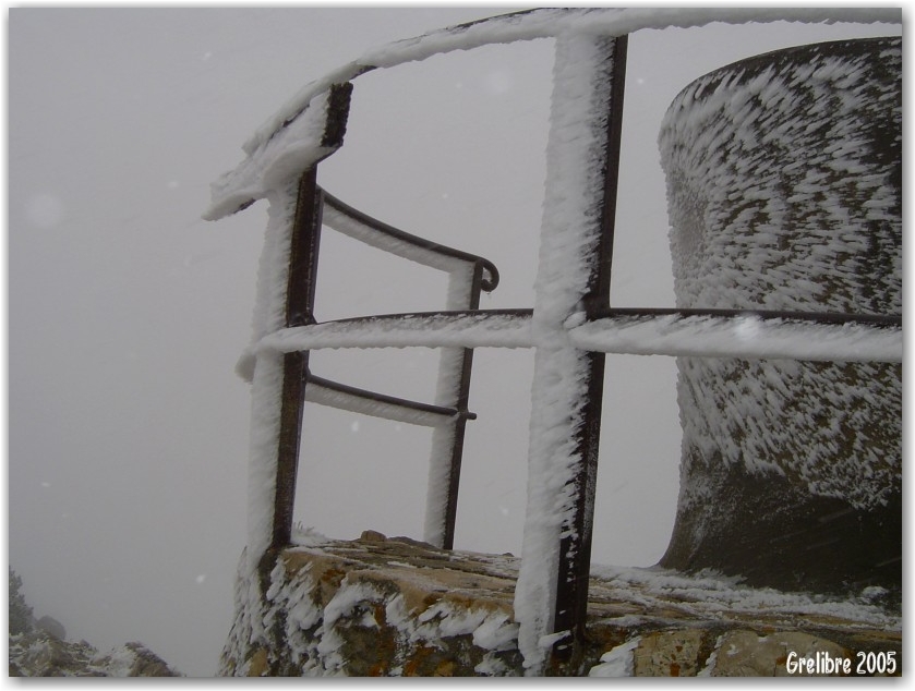 Au sommet le vent est fort et mes gants ainsi que ma cheminée (sorte de cagoule), me permettent de rester plusieurs minutes pour « admirer » (certains me prendront certainement pour un fou !) les formations de la neige et du givre sur les sapins… A noter, la température à l’abri du vent de -3°C ! Imaginez en plein vent (estimé à 70 km/h en rafale) avec la neige qui vous picote le visage !