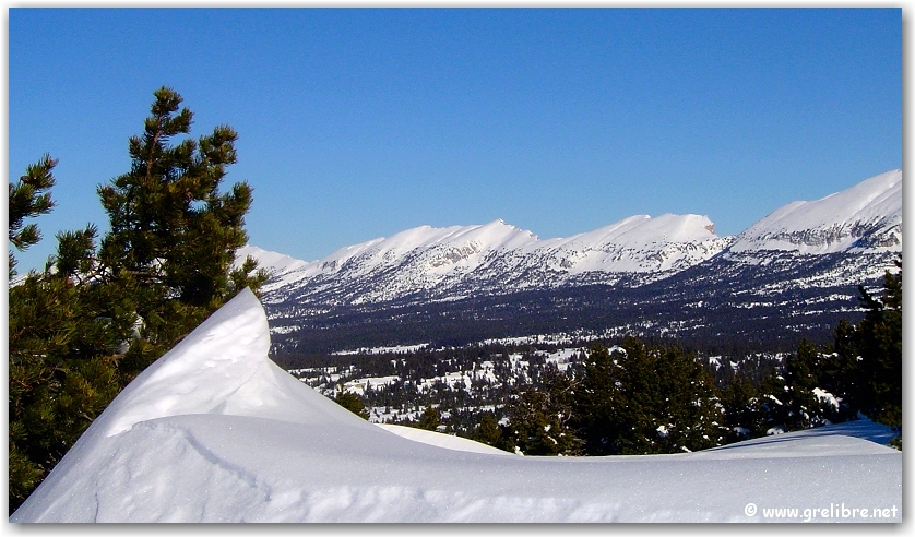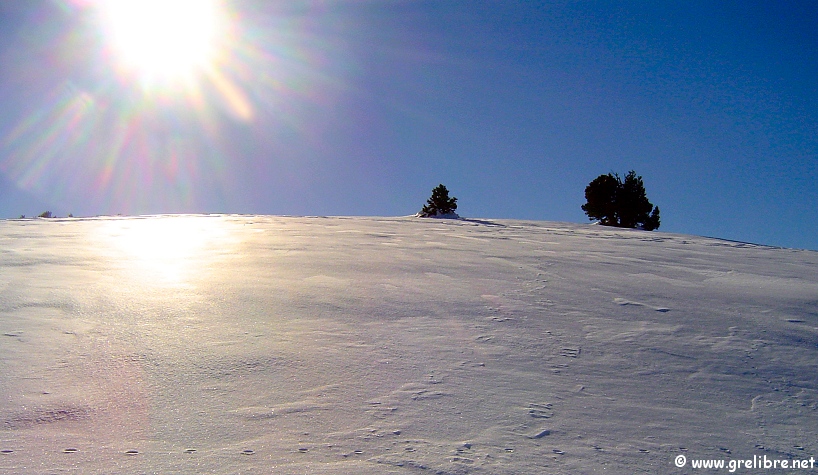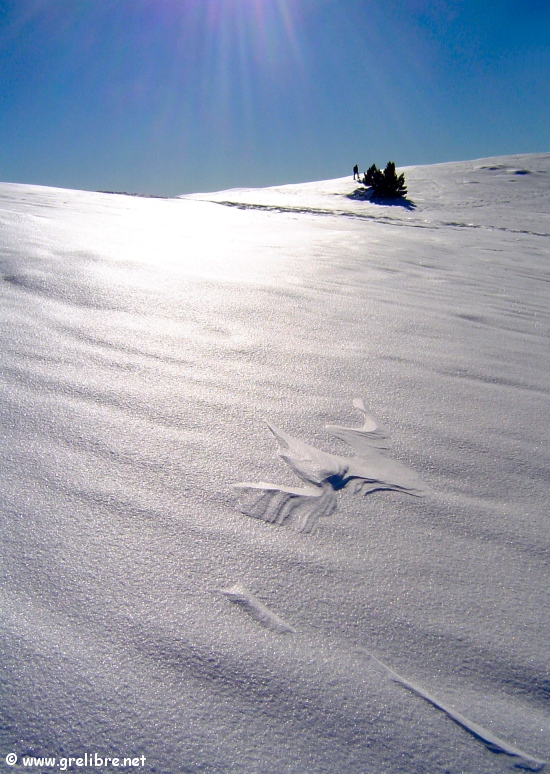 Après près d'une heure à naviguer à travers ces champs immenses de neige vierge et de congères, nous revenons doucement vers les crêtes du départ.