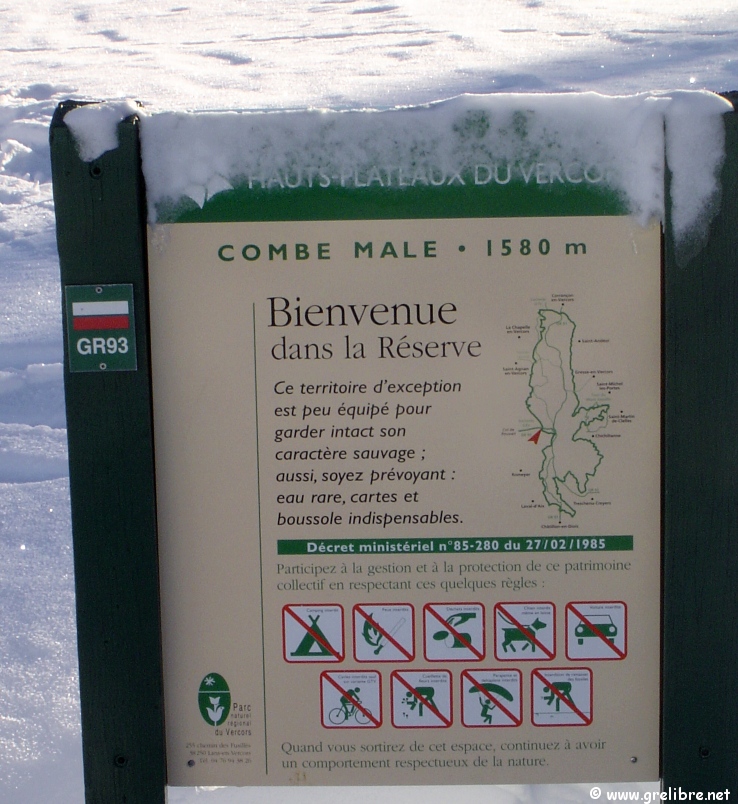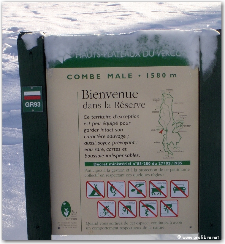 Nous reprenons le chemin tracé pour les skieurs de fond… Mince, nous n'avons pas payé notre redevance raquettes !! Ce tracé s'arrête juste aux portes de la Réserve des Hauts Plateaux du Vercors.