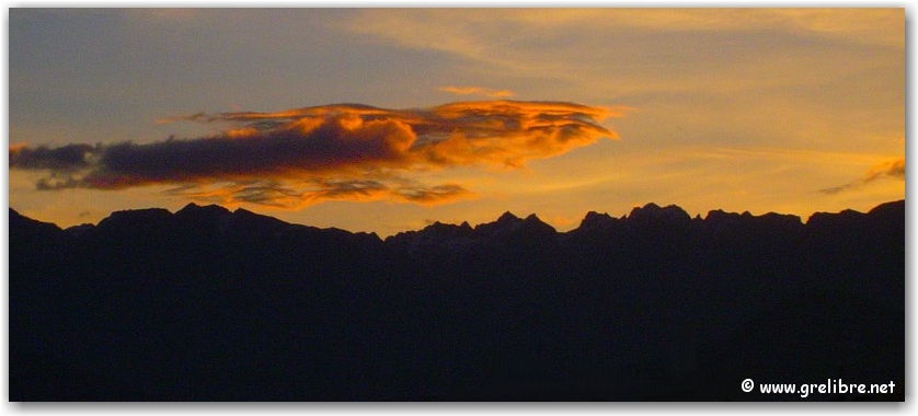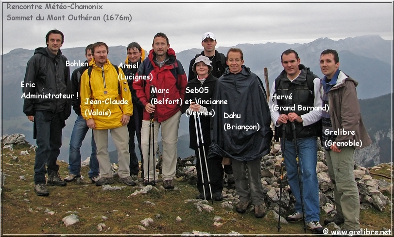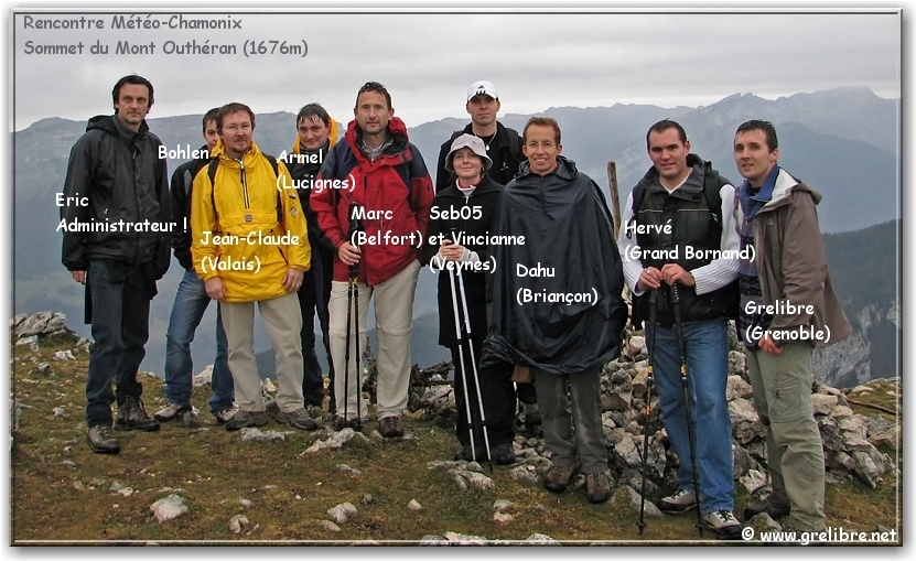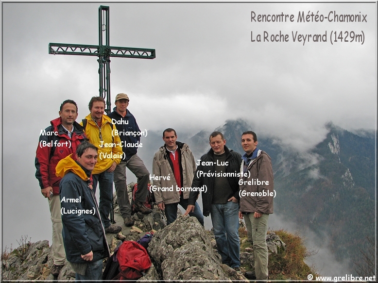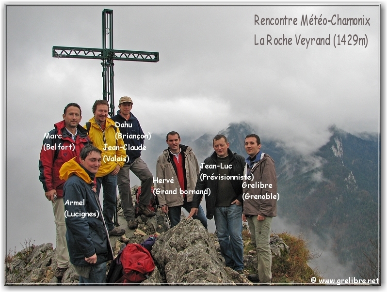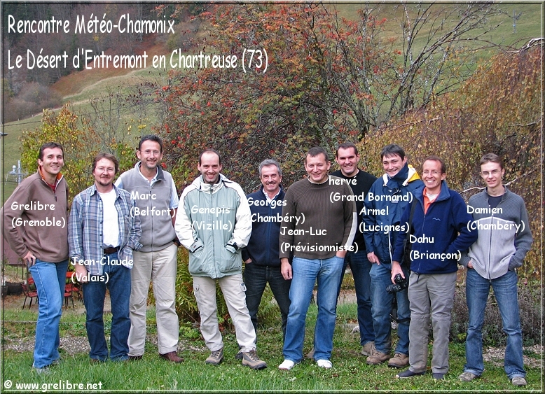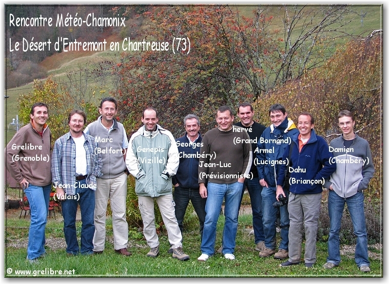 Citation… « Le côté sensitif ne peut être exclu. Bien sûr, on peut dire d’un alpiniste qu’il se prépare comme un autre sportif. Mais pour lui, se préparer, c’est établir aussi une relation avec la Montagne, s’en imprégner. » Jean-Christophe Lafaille Gre in Live… Retrouvez les photos de la rencontre des « membres » du site de Météo-chamonix… Observation du temps : Photo du jour : Neige sur Belledonne à ~2200 mètres ! Les Sorties…en photos !! Très bonne idée de faire une rencontre entre membres du site de Météo-Chamonix dans le massif de la Chartreuse !! Oui mais il y en a une qui s’est invitée sans demander !! Bien évidemment ce fut la pluie !! Celle-ci est arrivée pile au départ de notre première rando, samedi en début d’après midi !! Puis elle nous a suivi à chaque fois que nous sortions dehors !! C’est sûr, la prochaine fois on essayera de pas l’inviter !! Quelques photos de cette rencontre… Samedi 11 novembre : Allez, nous partons faire une rando… ça grimpe, n’est ce pas Dahu ! le ciel est très sympathique ! les crètes sont belles mais la vue manque !! Deux Chamois pendant cette balade ! Hervé est tenté par le saut « léger »… Nous lui annonçons qu’une bonne raclette est prévue le lendemain… il restera avec nous ! Le sommet est à peine humide !! Personne ne sera malade… Enfin presque, n’est ce pas Eric ! La redescente se fera de nuit à la demande de Vincianne !! Dimanche 12 novembre : une autre rando… les sommet toujours très humides ! Petit hameau, Le Désert d’Entremont situé au dessus d’Entremont le Vieux dans le Massif de la Chartreuse Quelques trouées… avec soleil, ici, les hameaux des Vincents et Claret Après cette sortie bien humide, heureusement, Jean-Claude nous avait réservé une raclette exceptionnelle ! Une vraie Raclette Suisse ! Merci Jean-Claude !! Merci à tous pour cette belle rencontre… Une pensée à ceux qui n’ont pu nous rejoindre et une spéciale à Bohlen qui a souhaité testé les dépanneuses Chambérienne !! En repartant, l’Alpe (Le Pinet)… N’hésitez pas à commenter cet édito en allant écrire un petit mot dans le livre d’Or du site http://www.grelibre.net Les infos… Info du jour : Indice Air: Demain, lundi: 4/10 = Bon Les prévisions… La suite ? moyen avec éclaircies et nuages… IL Y A UN AN… Le 12 novembre 2005 !! |