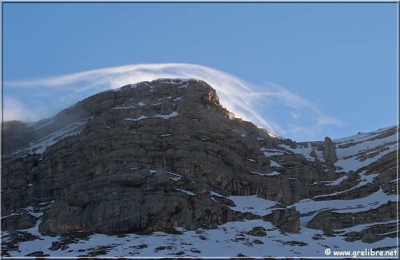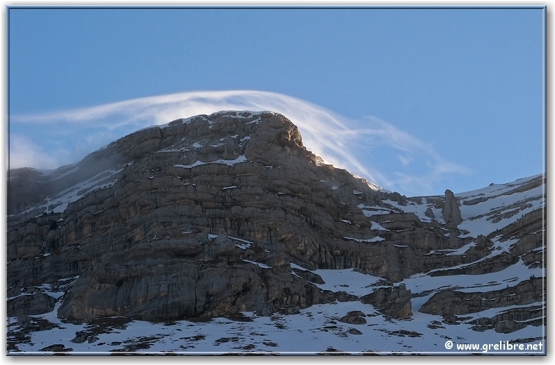 Le vent souffle fort au sommet de la Dent (à voir les nuages filer). Le passage du Pas de l’Oeil reste délicat à pied !