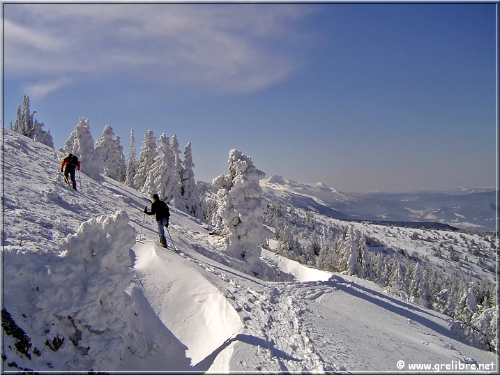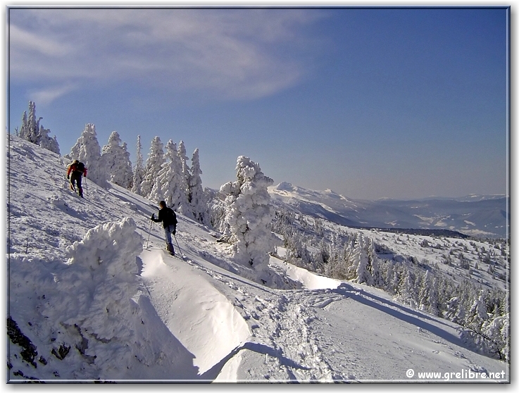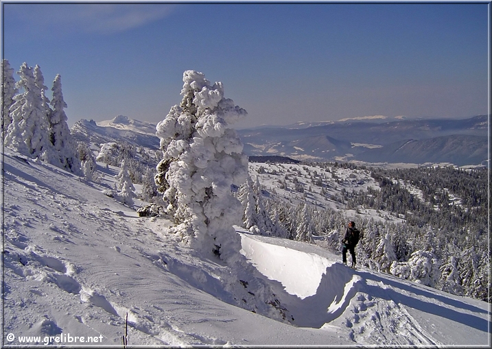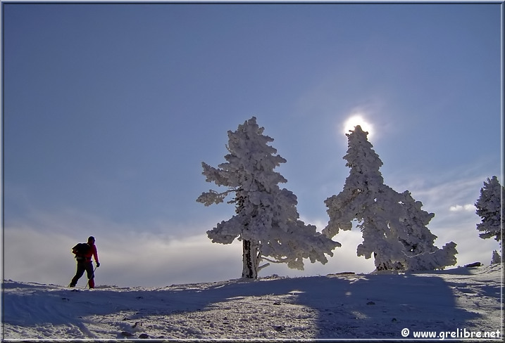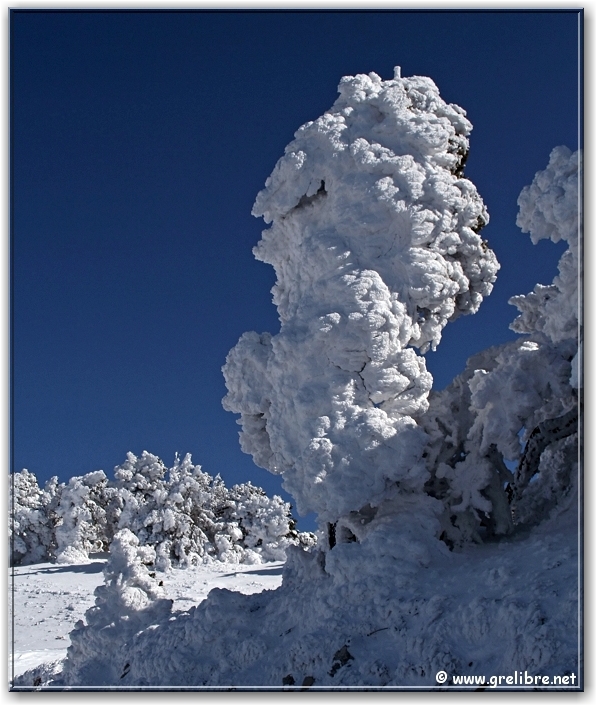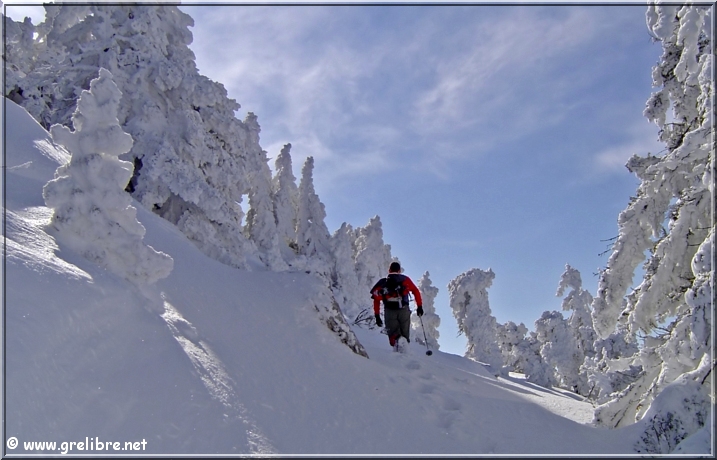 Bref, magnifique sortie puisque dès 1700 mètres, nous sommes sortis des nuages ! Au-dessus, c’est l’apothéose ! Un ciel bleu encre et des sapins très platrés (certains supportaient une épaisseur supérieure à 50 centimètres à l’horizontal)!