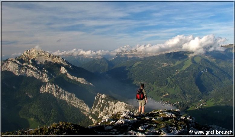Grelibre en short au sommet avec la vue sur le grand Som, le Granier, le Mont Blanc, l’Alpe, les Lances de Malissard…