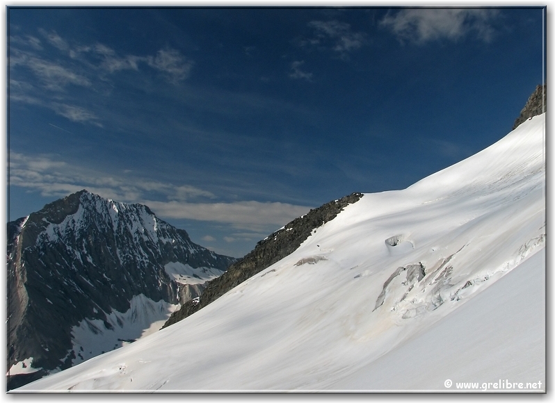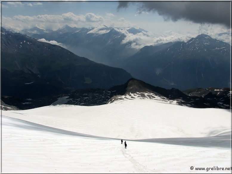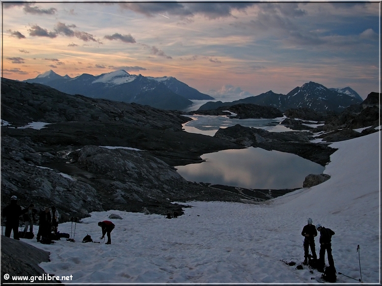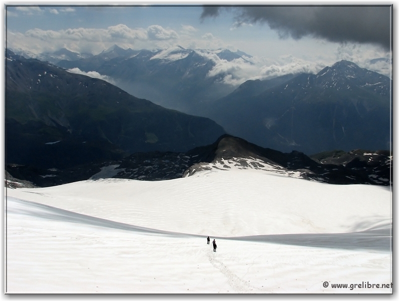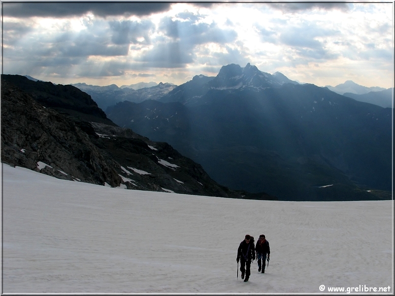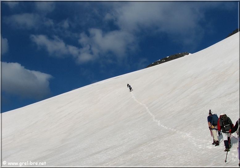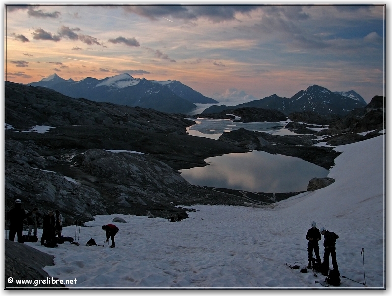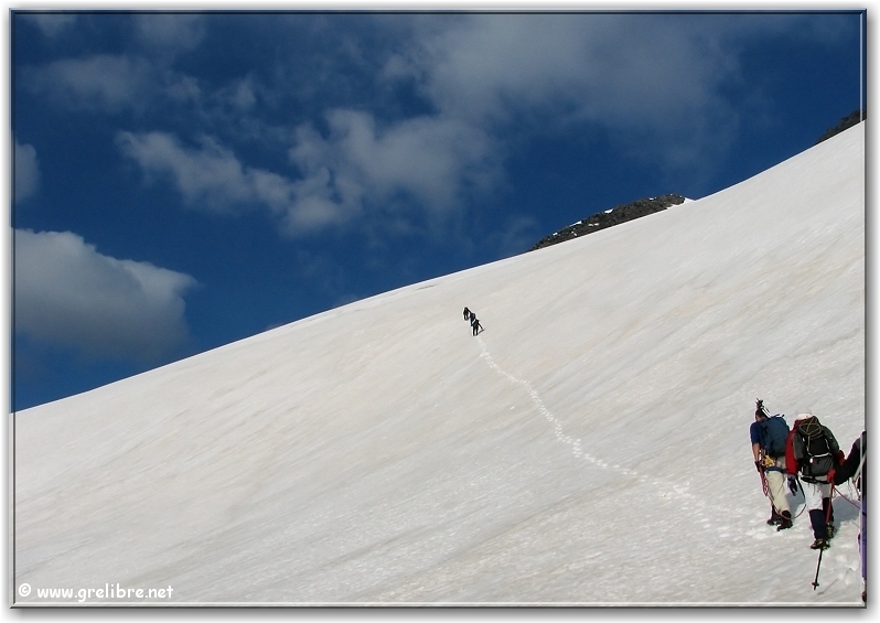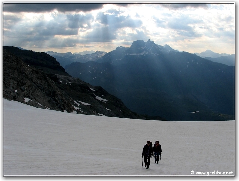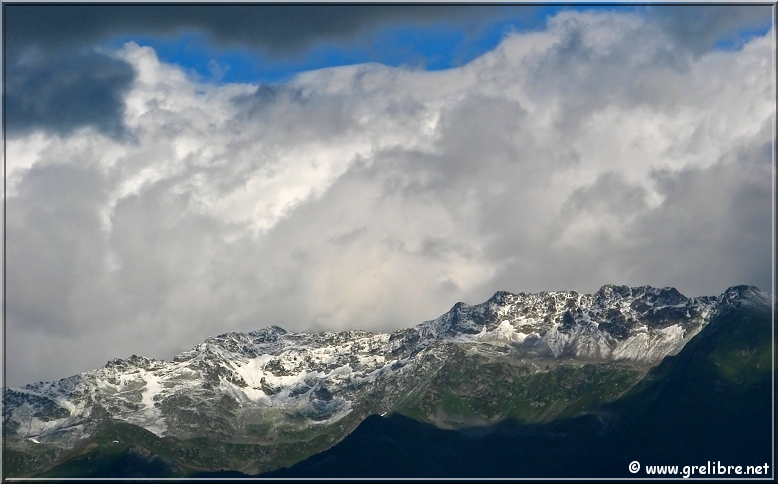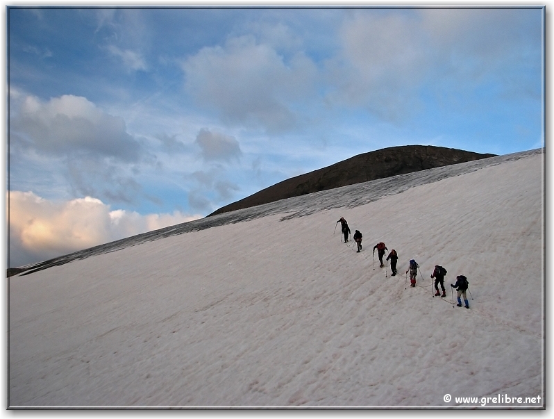 VACANCES… Pas d’édito avant la fin du mois… bon courage à ceux qui bossent ! Citation… Nous croyons regarder la nature et c’est la nature qui nous regarde et nous imprègne. Gre in Live… Ayant très très peu de temps actuellement, les éditos seront relativement succints, laissant plus la place aux photos du week end dernier pour le Dôme de l’Arpont… Observation du temps : N’hésitez pas à cliquer sur les photos pour les agrandir dans leur format original… Photo du jour : Le retour de la neige sur belledonne vers 2000 mètres ! mercredi soir : Le retour de la neige sur belledonne vers 2000 mètres ! mercredi soir : arc en ciel intense au-dessus de Grenoble Les Sorties… en photos !! Magnifique sortie ce week-end en Vanoise pour aller gravir le Dôme de l’Arpont à 3599 mètres d’altitude. Pendant plusieurs éditos, je vais essayer de vous montrer en images ce que fut cette superbe randonnée alpine… La première partie était consacrée à la montée au refuge de l’Arpont à 2300 mètres (voir édito précédent). Après plus d’une heure d’approche, nous arrivons au pied du glacier de l’Arpont. Le soleil se lève à peine… une première cordée est déjà partie la montée est longue… les nuages sont déjà présents dans le ciel ! Il faut encore monter… 1300 mètres de dénivellé depuis le refuge ! La Dent Parachée se dresse à nos cotés ! Panorama au sommet… malheureusement, la visibilité est très médiocre ! Au Nord, le Dôme de Chasseforêt à 3586 mètres Redescente plus facile dans de la neige assez légère au col Il faut tout de même faire attention car même si le glacier est bien recouvert, les crevasses sont là ! N’hésitez pas à commenter cet édito en allant écrire un petit mot dans le livre d’Or du site http://www.grelibre.net Les infos… Info du jour : Indice Air: jeudi: 3/10 = Bon Indice Allergique: Demain, jeudi: 3/5 = moyen(pollens de graminés) Les prévisions… La suite ? Beau temps et chaud dès vendredi et pour 3 jours ! Tendance météo : voir rubrique Tendance Météo sur http://www.grelibre.net IL Y A UN AN… Le 29 juin 2006 !! |