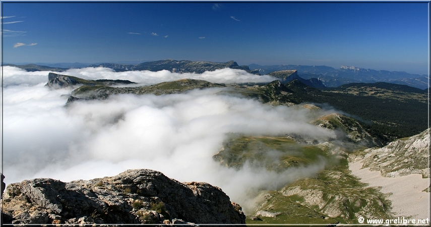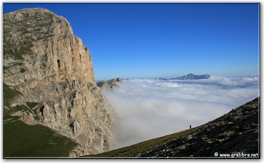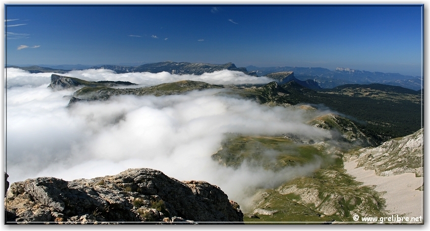 Samedi, nous nous sommes réveilés dans une vraie purée ! Du coup, le réveil fut décaller de 5 à 8 heures… Bon il faut dire que la nuit fut mouvementée par le vent fort et surtout les températures bien basses (autour de 3°C). A 8 heures, nous sommes toujours dans les nuages mais on devine le ciel bleu au-dessus. Alors direction l’Aiguillette (ou petit Veymont). Et là, ce fut le spectacle !