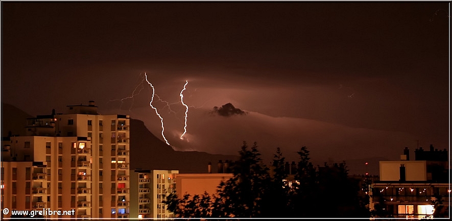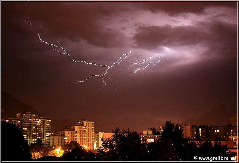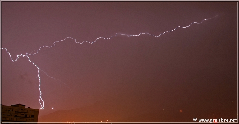 hier, mercredi 29 août : Journée de transition avec quelques orages le matin et de bonnes averses. Puis une belle accalmie s’est imposée en fin de journée. C’était le calme avant la tempête puisque quelques heures après (vers 21 heures) les premiers éclairs étaient visibles de Grenoble en direction de Voreppe. Les éclairs se sont multipliés entre 21 heures et 22 heures mais toujours sans pluie (sur mon secteur, Grenoble Ouest). Vers 21h45, le vent s’est levé avec des rafales bousculant même mon appareil photo sur son pied ! Un mur d’eau est arrivé sur Grenoble et s’est abattu sur l’agglomération pendant près de 30 minutes avec des intensités remarquables (350mm/h à Echirolles et 300 mm/h à SMH). L’ami Bohlen aura certainement fait un édito sur cette soirée !! Les orages n’ont cessé que vers minuit pour reprendre vers 2 heures à 2 heures 30 ! Quelle nuit !!